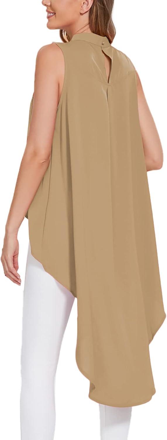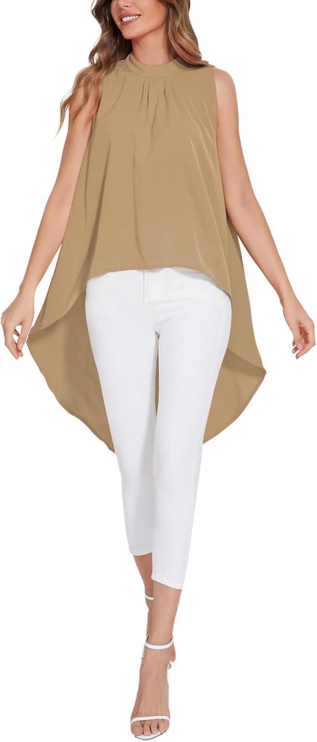 LYANER Women’s Asymmetrical High Low Sleeveless Mock Neck Flowy Blouse Tops(Khaki)