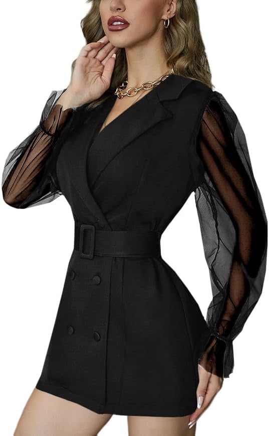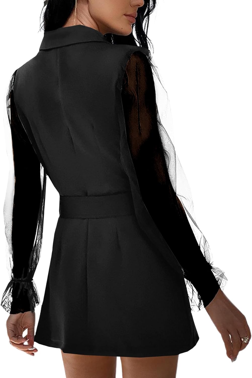 LYANER Women’s Elegant Collar V Neck Lace Long Sleeve Blazer Mini Dress with Belt(Solid Black)