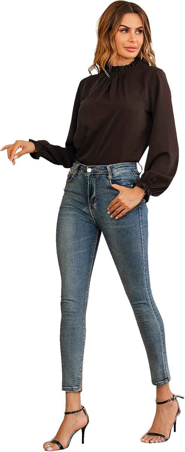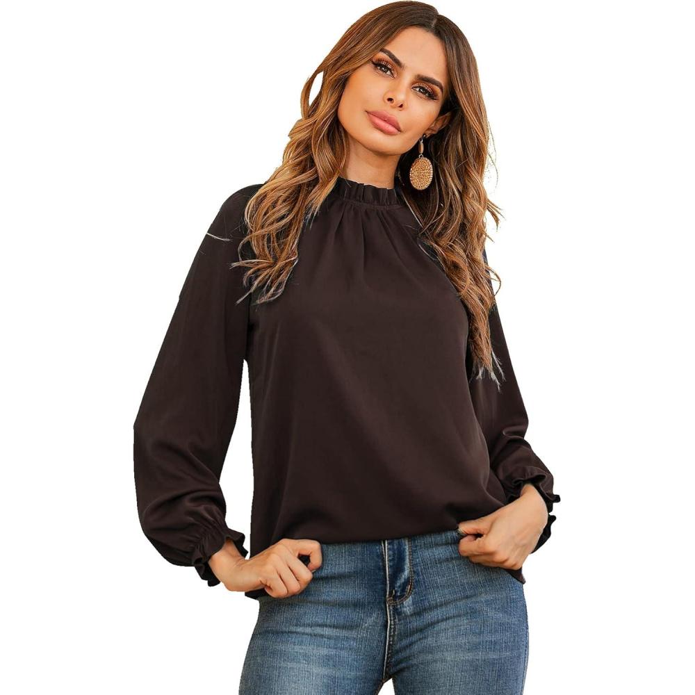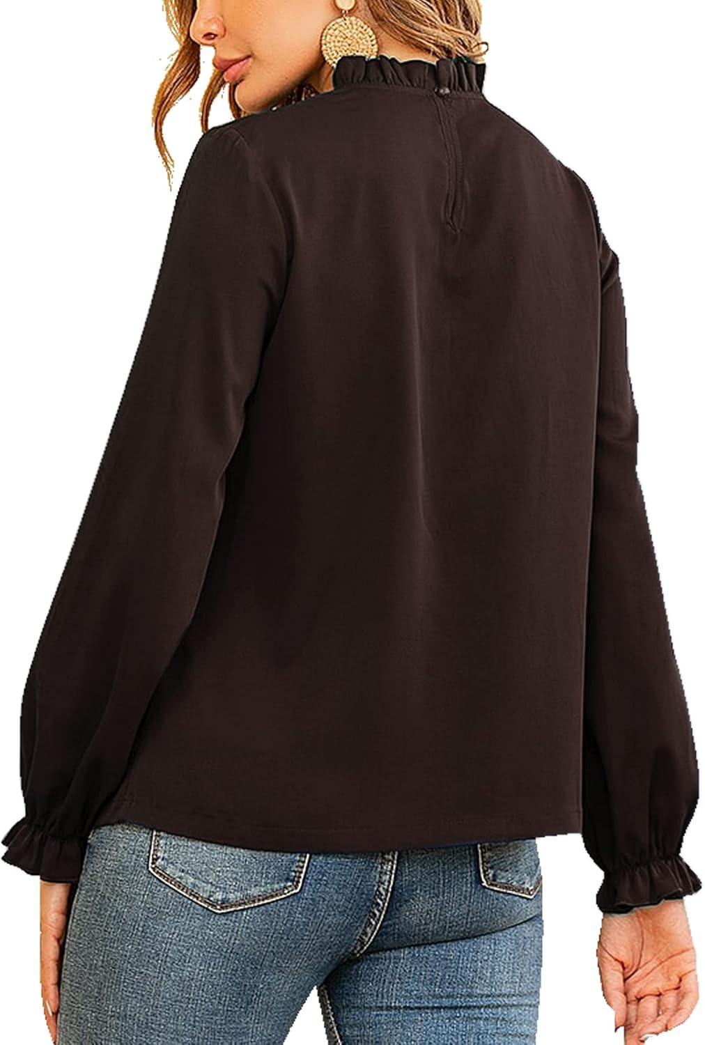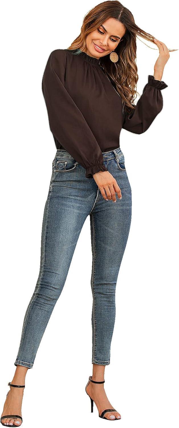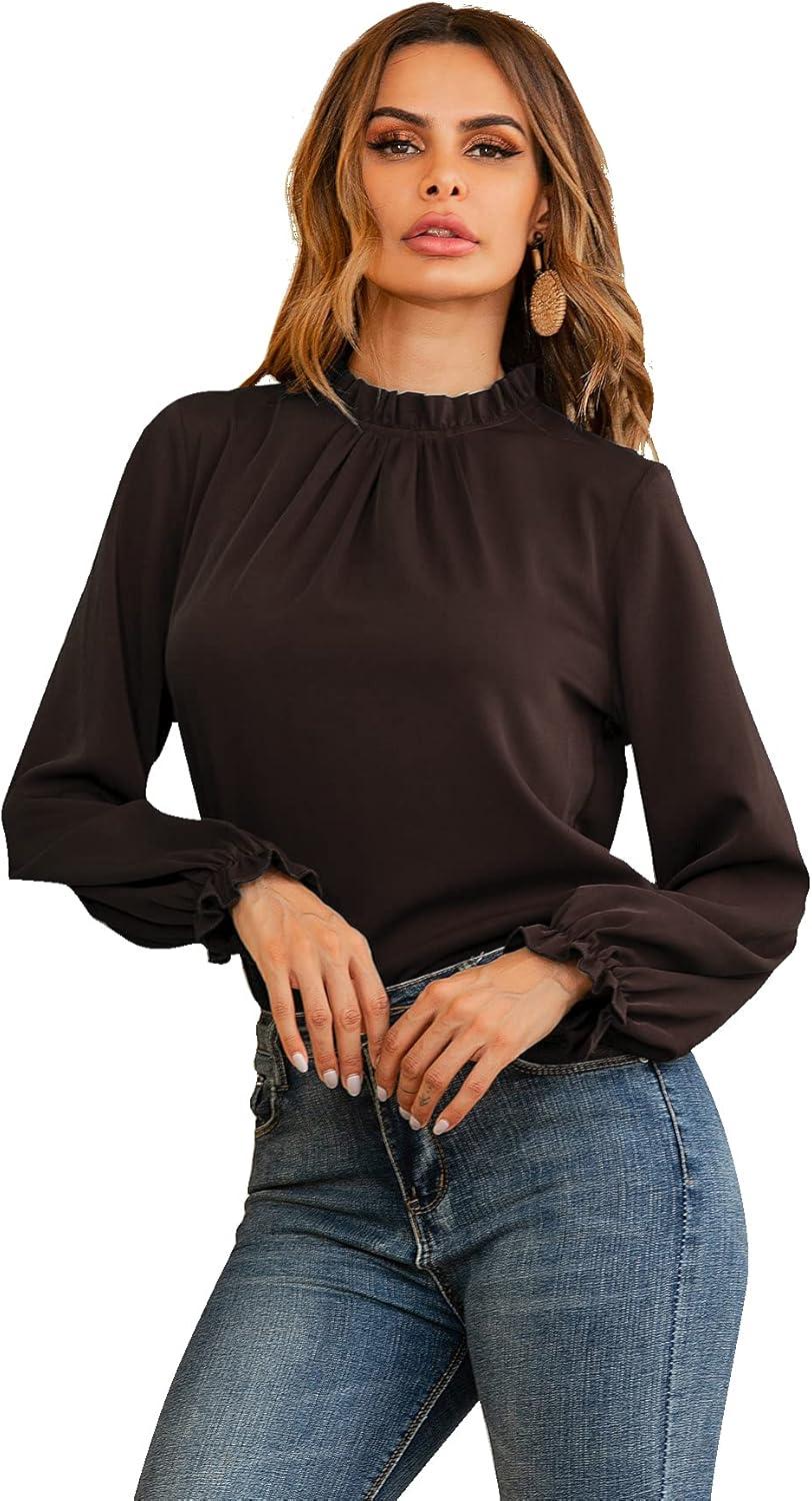 LYANER Women’s Frill Mock Neck Flounce Long Sleeve Solid Blouse Office Shirt Top(Brown)