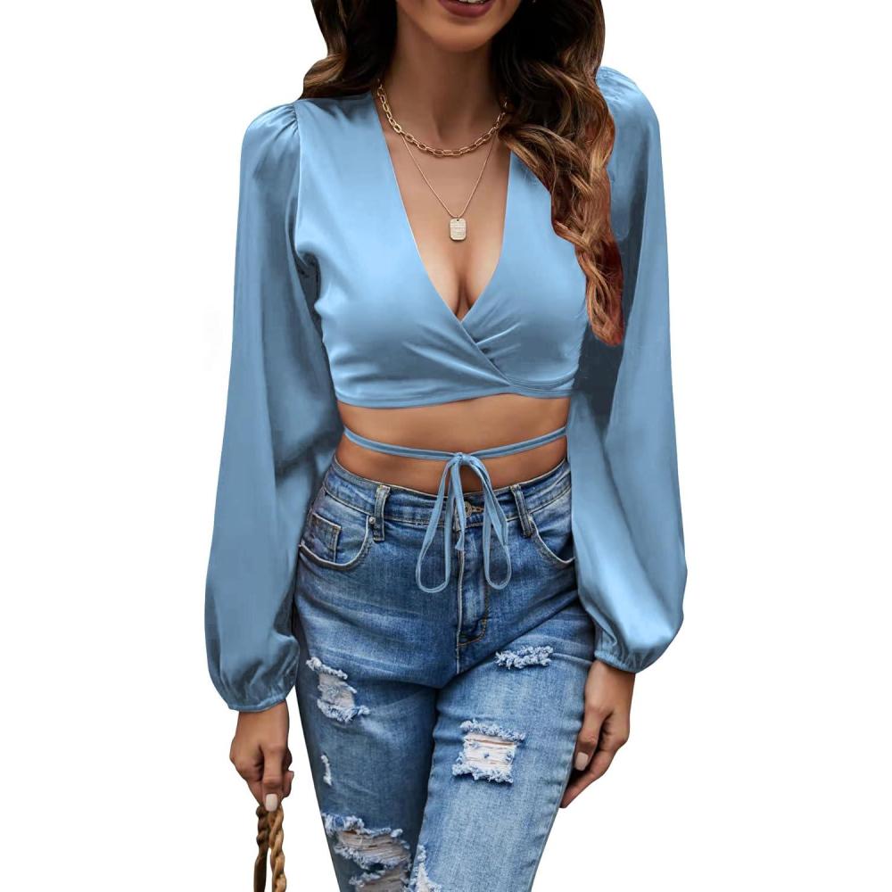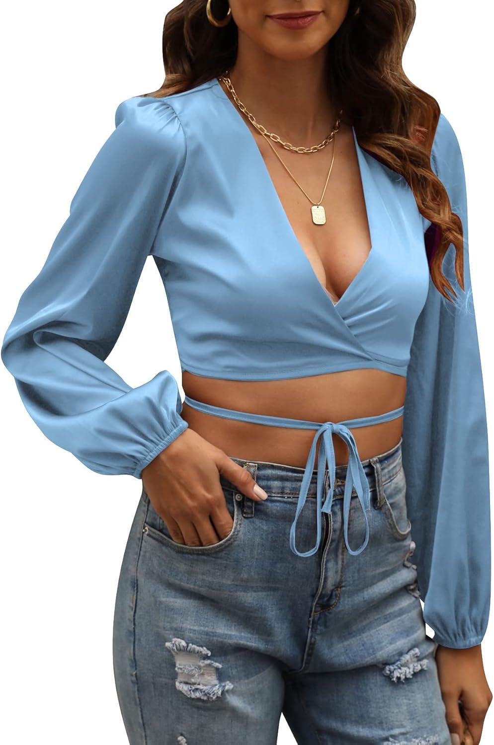 LYANER Women’s Satin Wrap V Neck Criss Cross Tie Long Sleeve Crop Blouse Top(Azure)