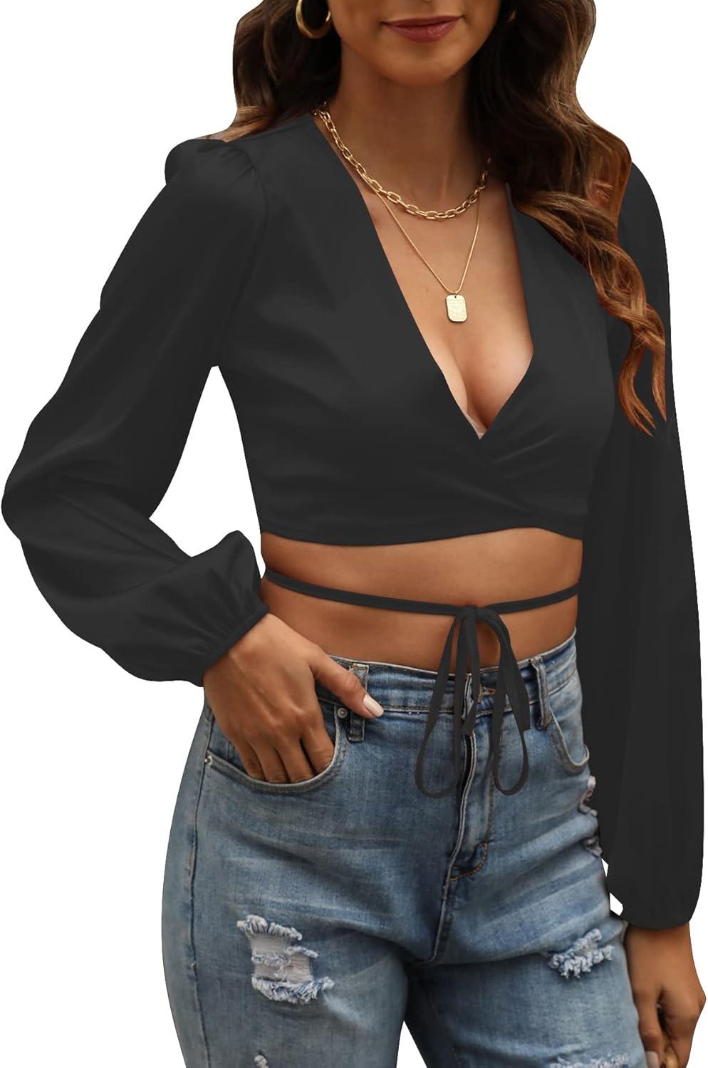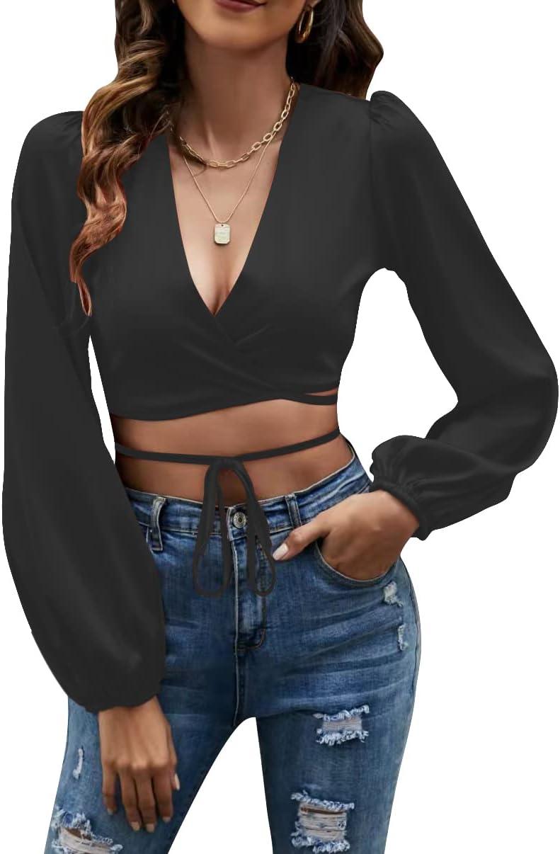 LYANER Women’s Satin Wrap V Neck Criss Cross Tie Long Sleeve Crop Blouse Top(Black)