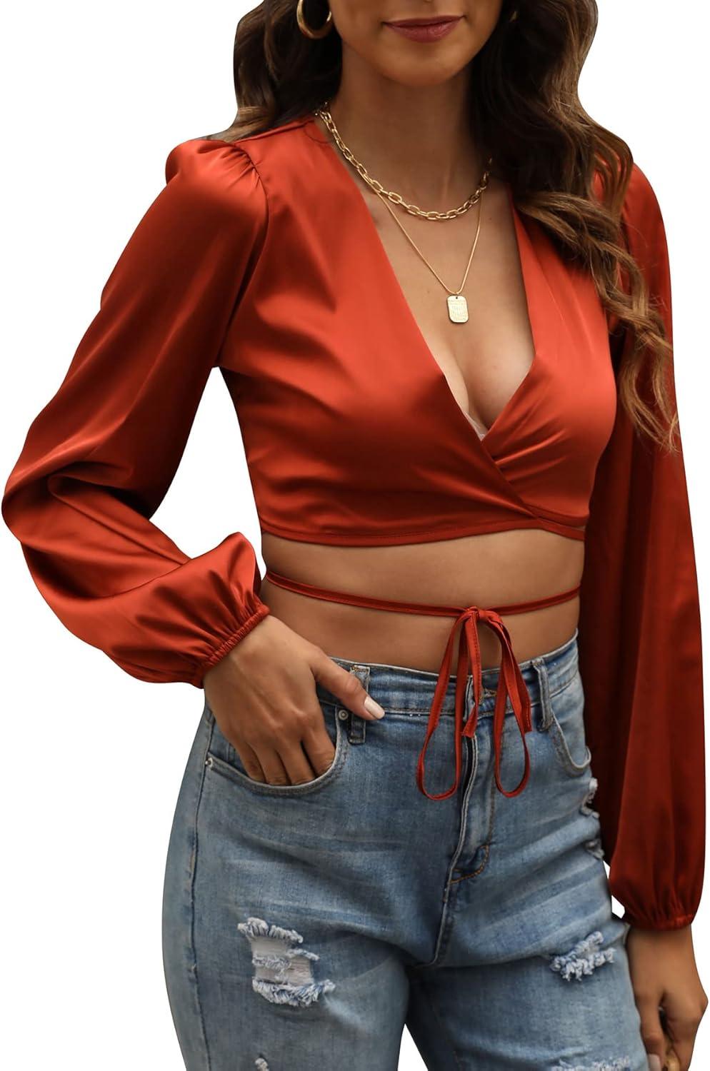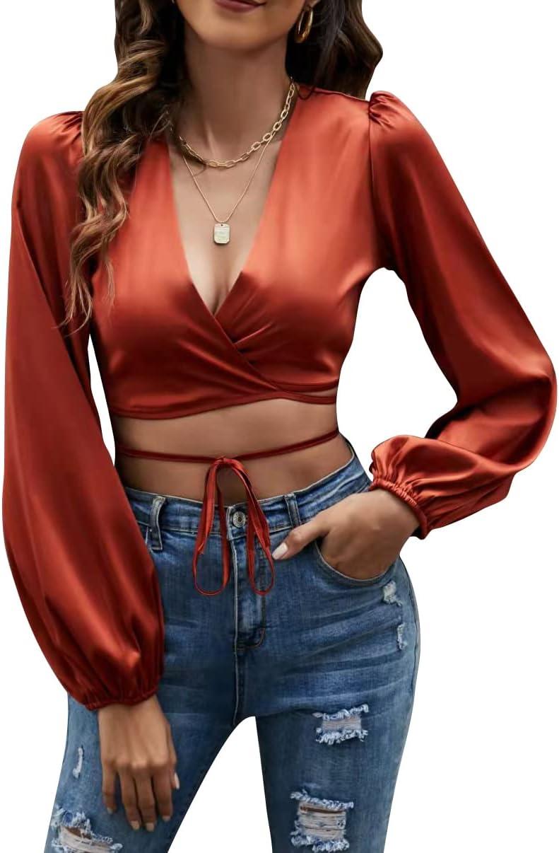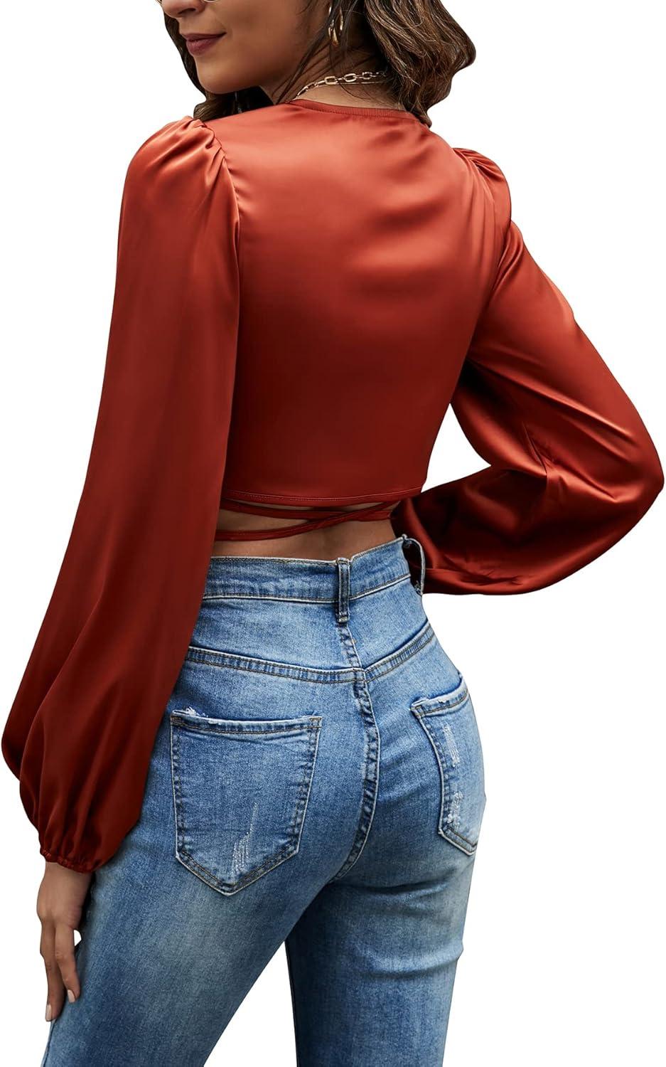Get up to 60% off on LYANER Women’s Satin Wrap V Neck Criss Cross Tie Long Sleeve Crop Blouse Top(Brown) styles during our winter sale event.
