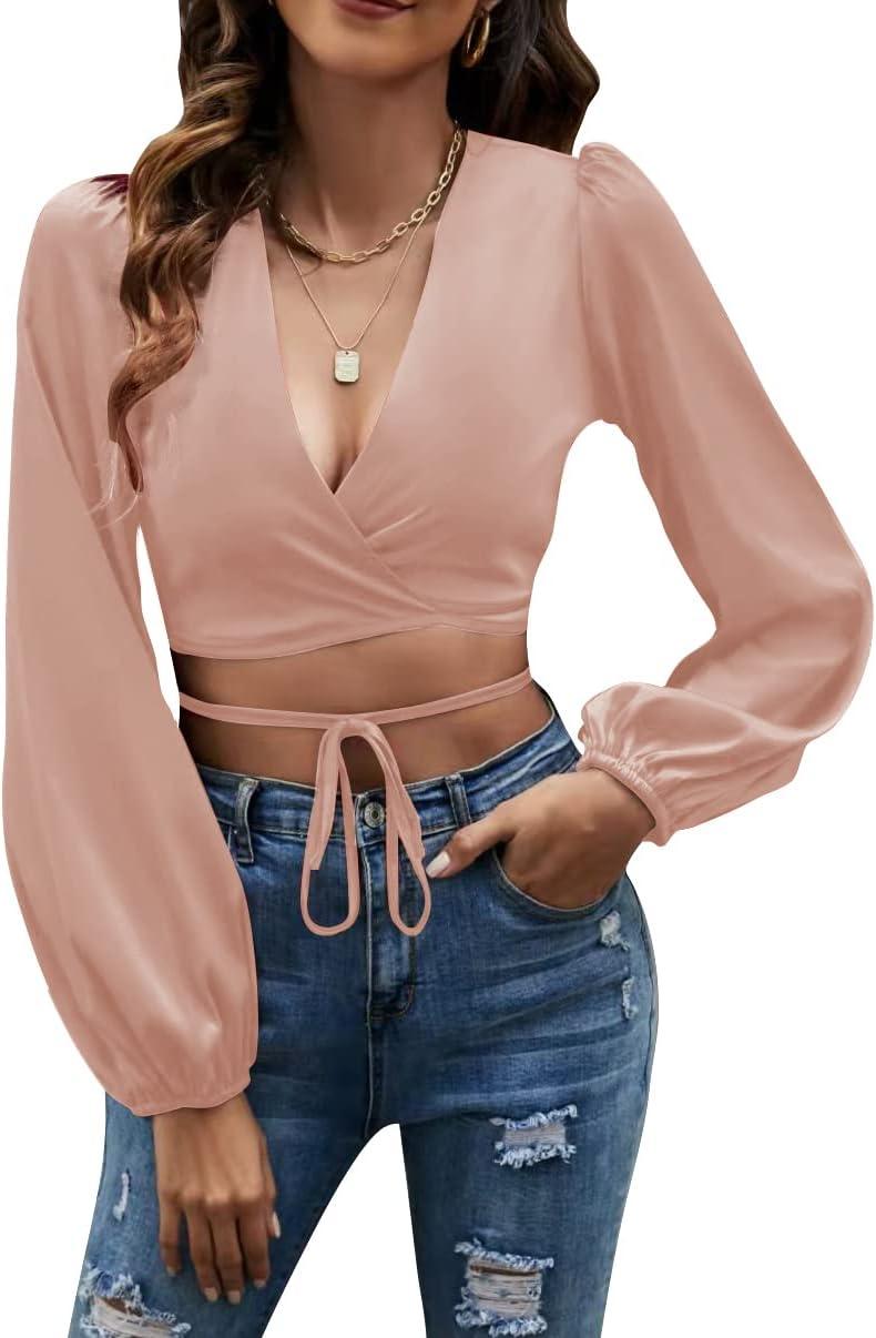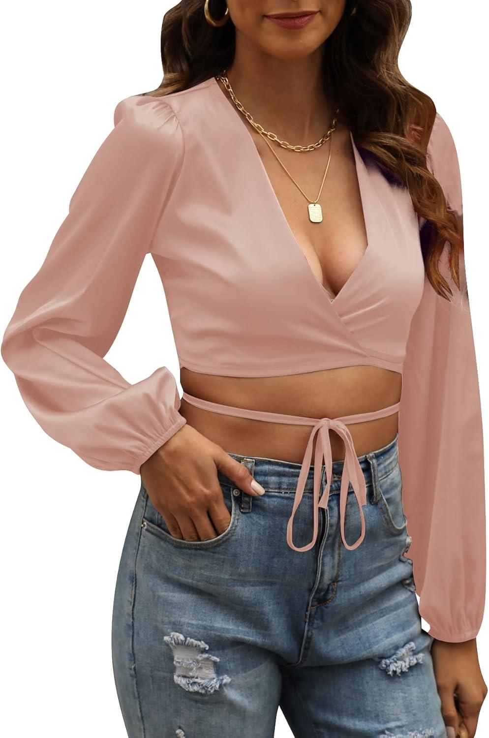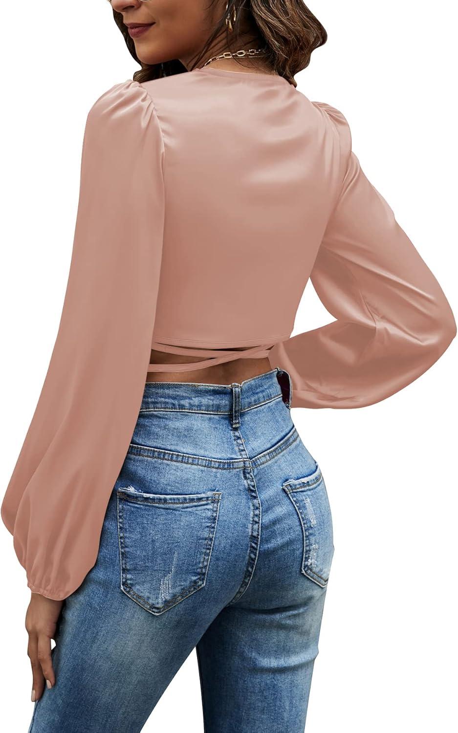 LYANER Women’s Satin Wrap V Neck Criss Cross Tie Long Sleeve Crop Blouse Top(Dusty Pink)