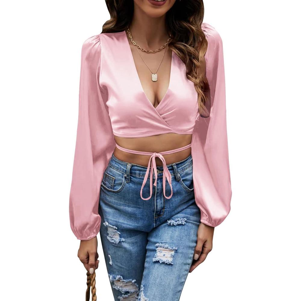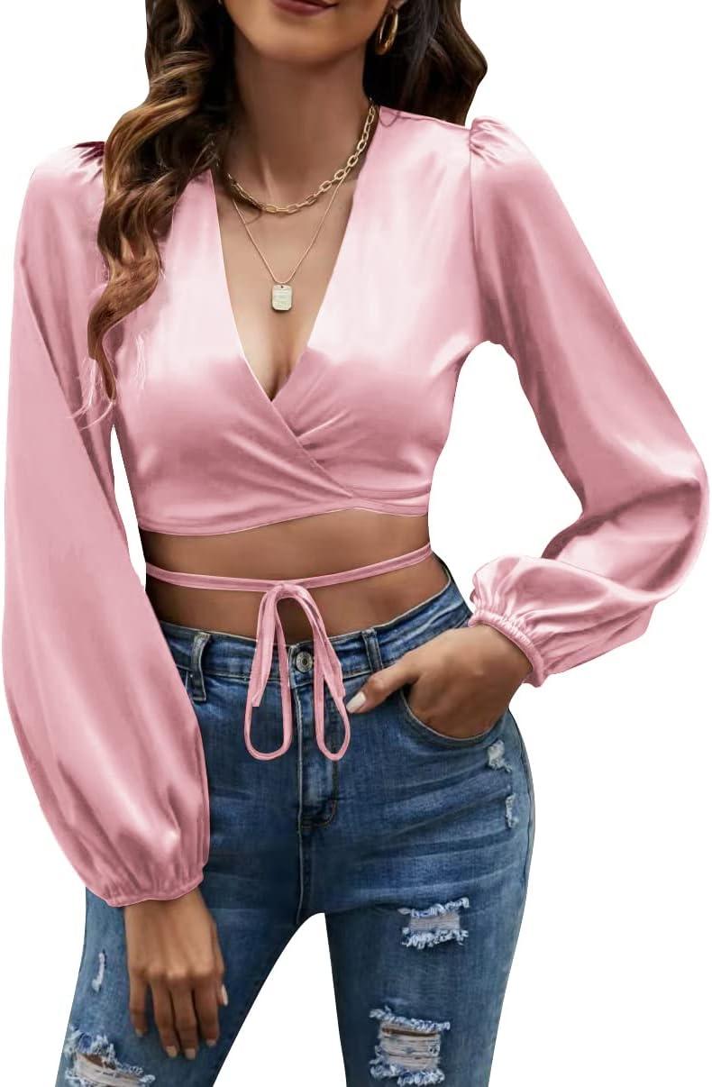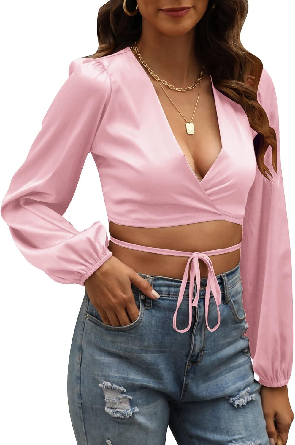 LYANER Women’s Satin Wrap V Neck Criss Cross Tie Long Sleeve Crop Blouse Top(Light Pink)