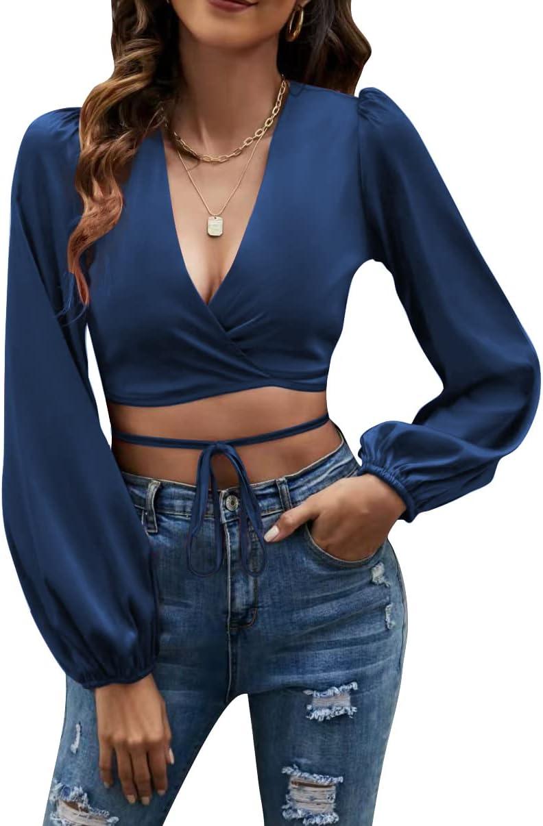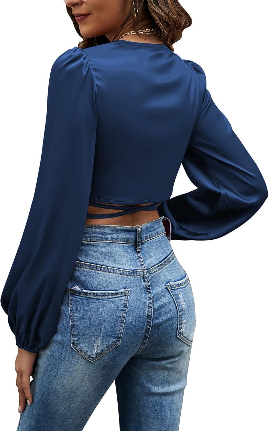LYANER Women’s Satin Wrap V Neck Criss Cross Tie Long Sleeve Crop Blouse Top(Navy Blue)