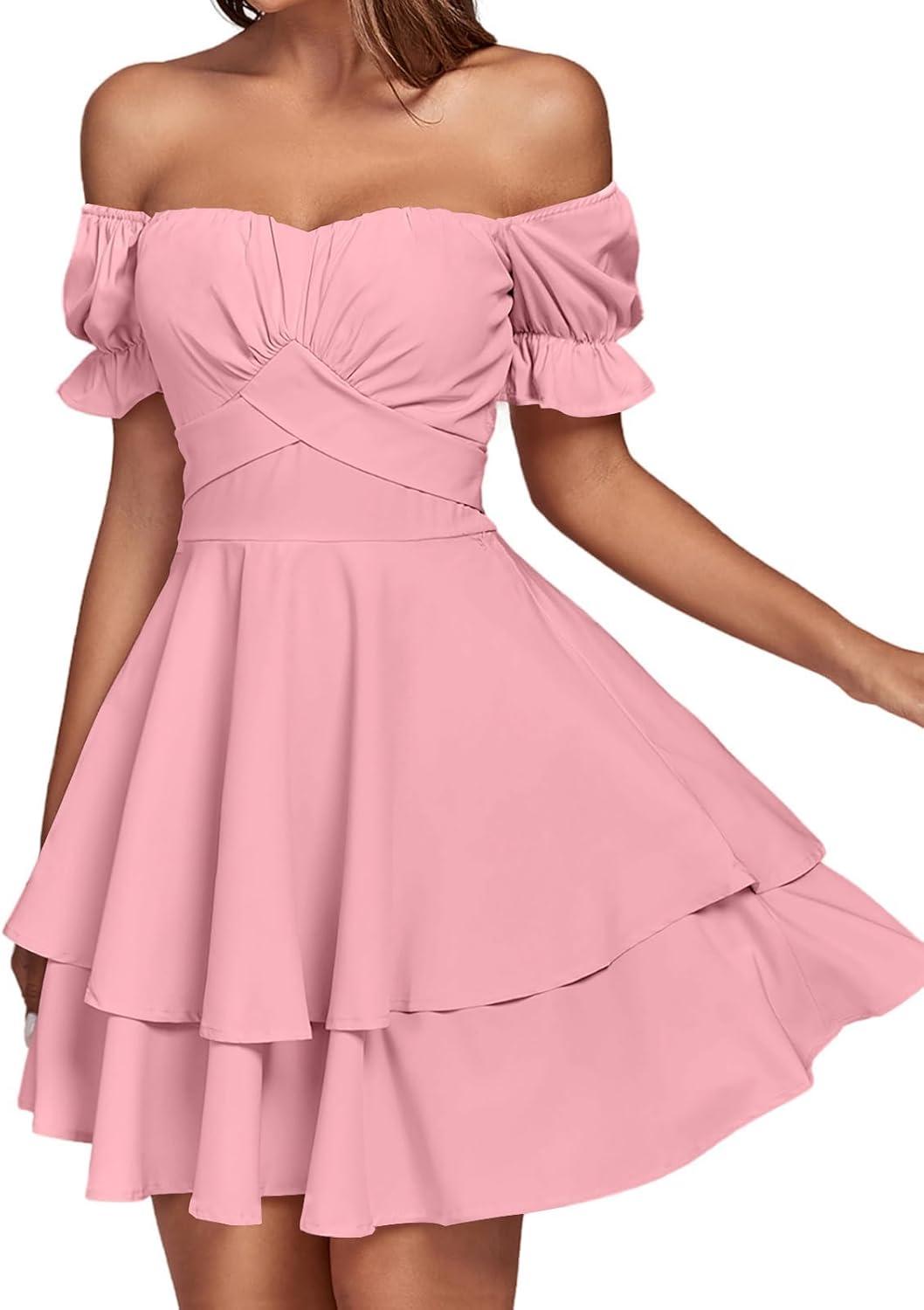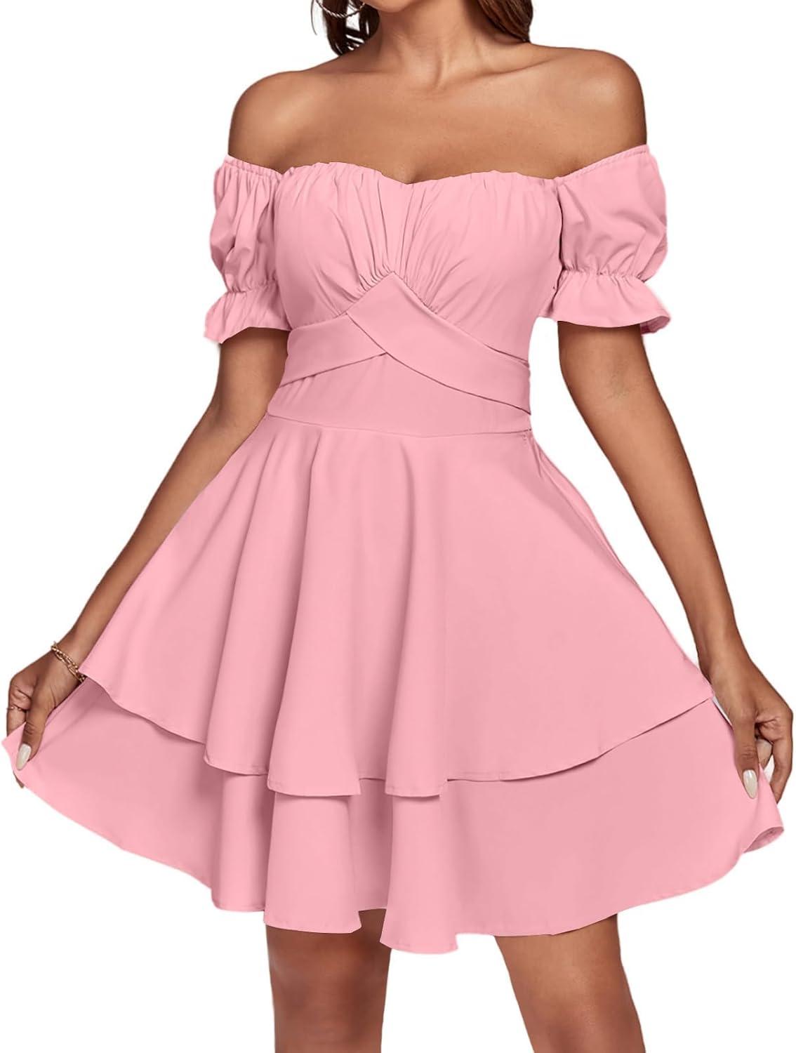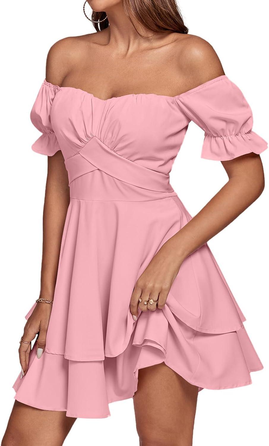 LYANER Women’s Tie Back Off Shoulder Wrap Layer Ruffle Short Sleeve Mini Dress(Solid Pink)