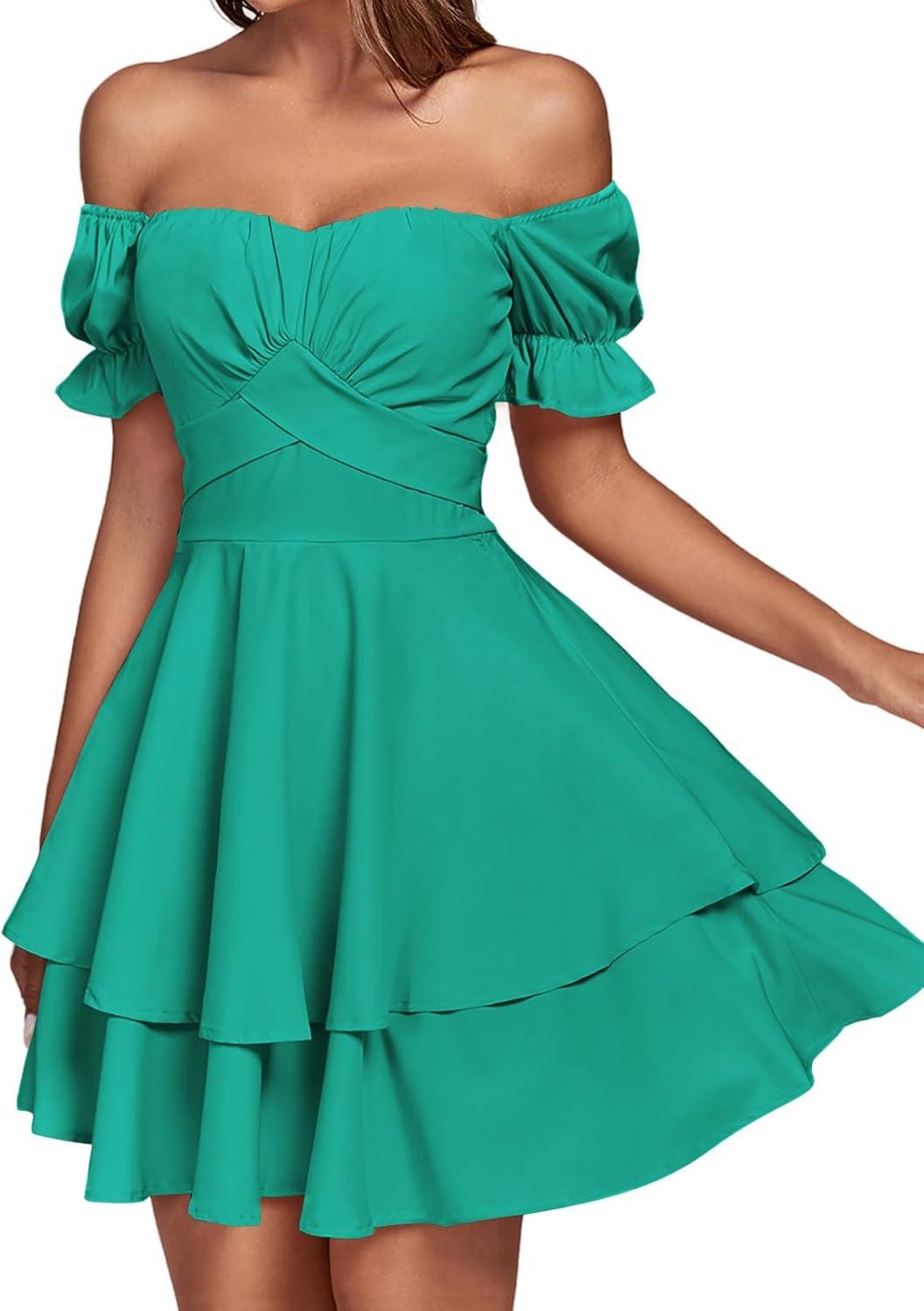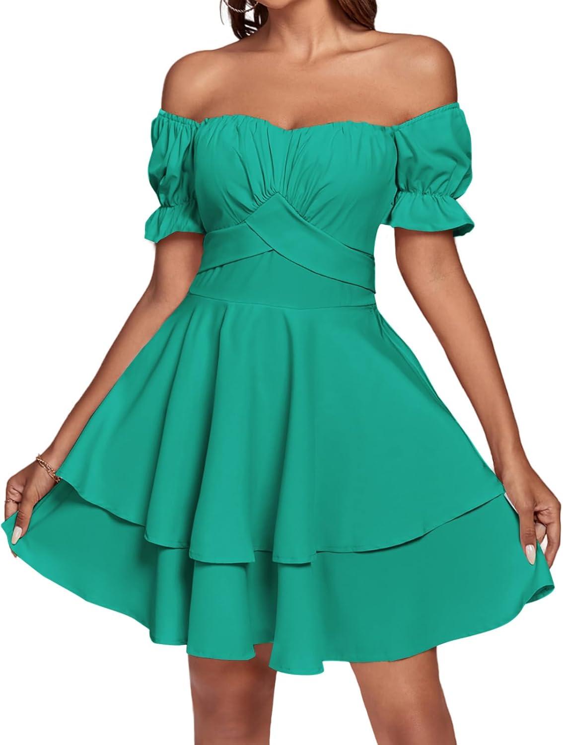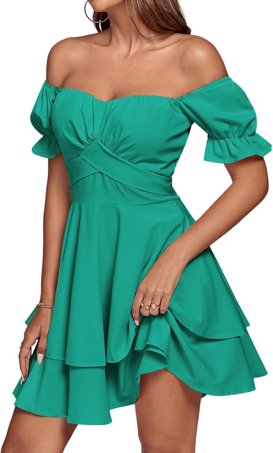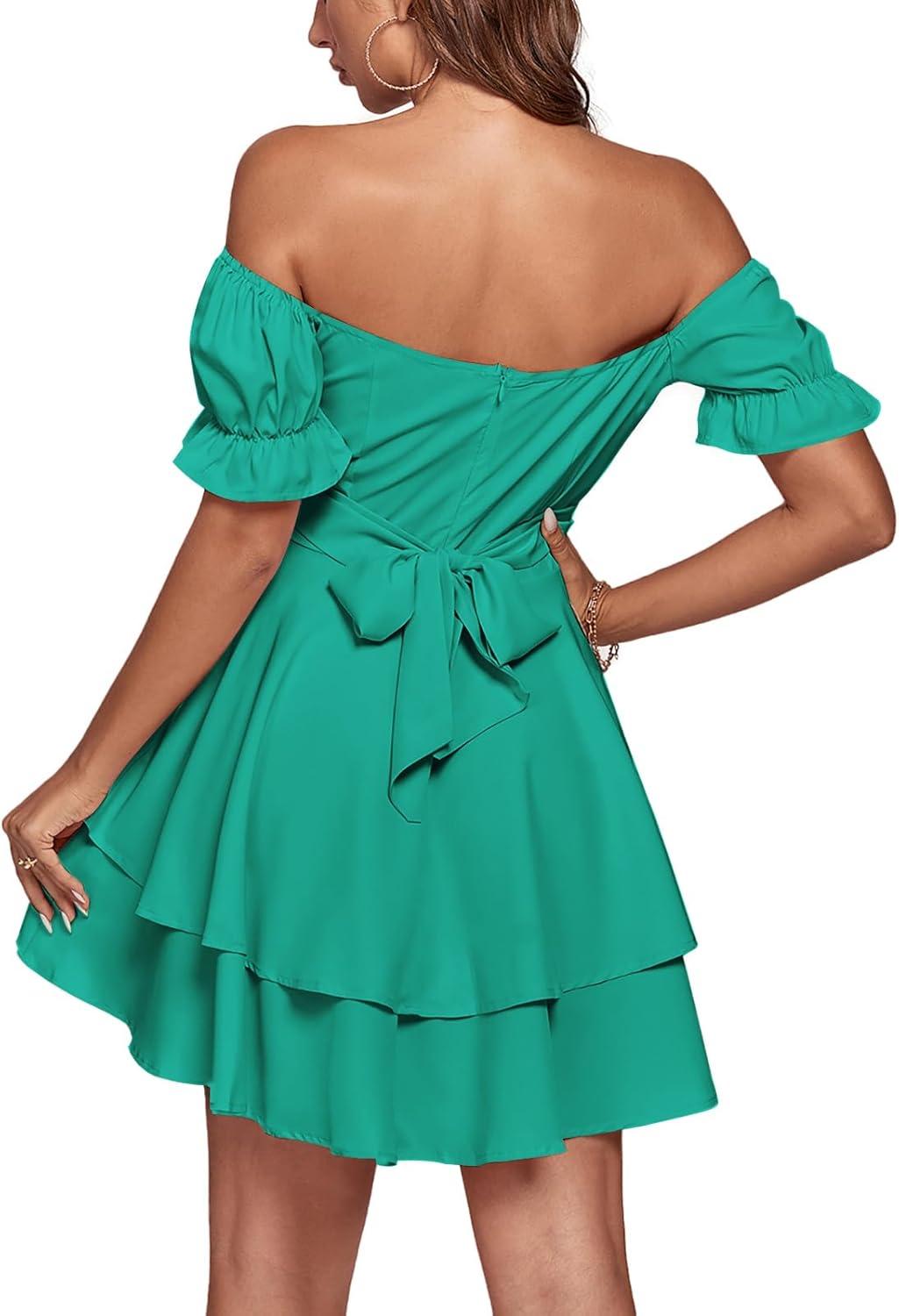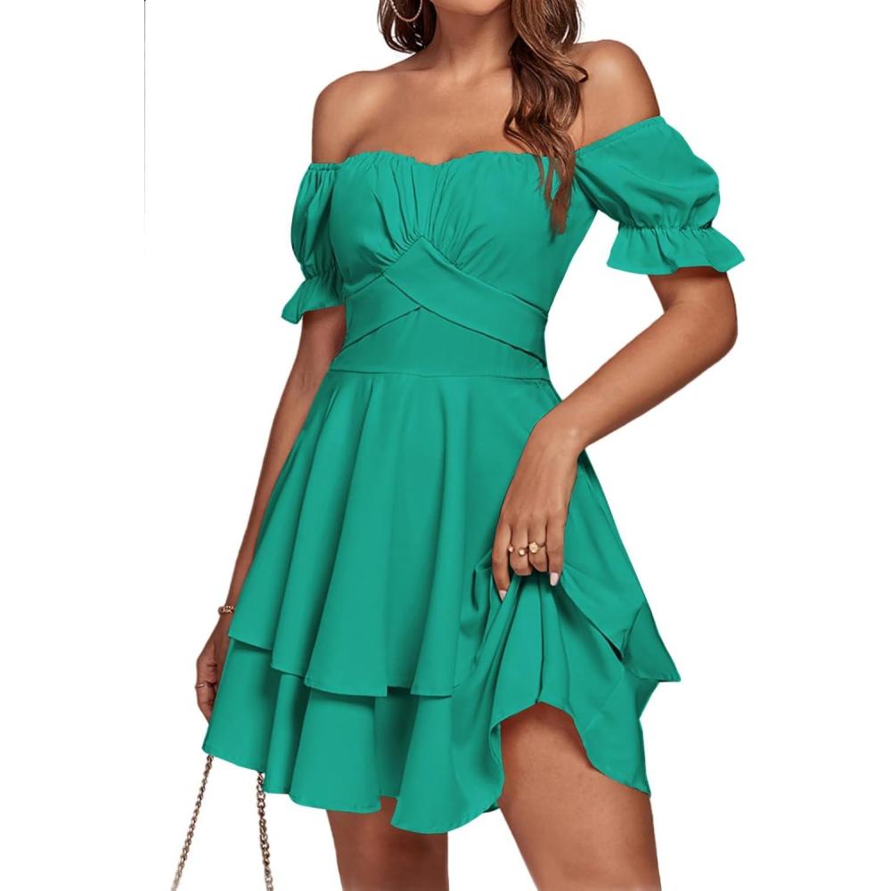 LYANER Women’s Tie Back Off Shoulder Wrap Layer Ruffle Short Sleeve Mini Dress(Solid Turquoise)