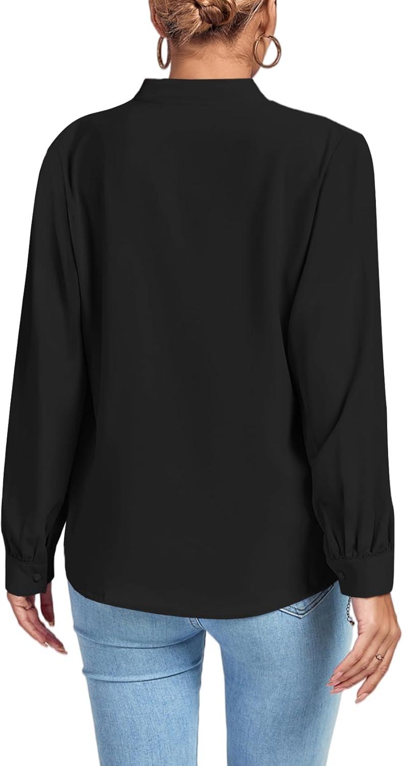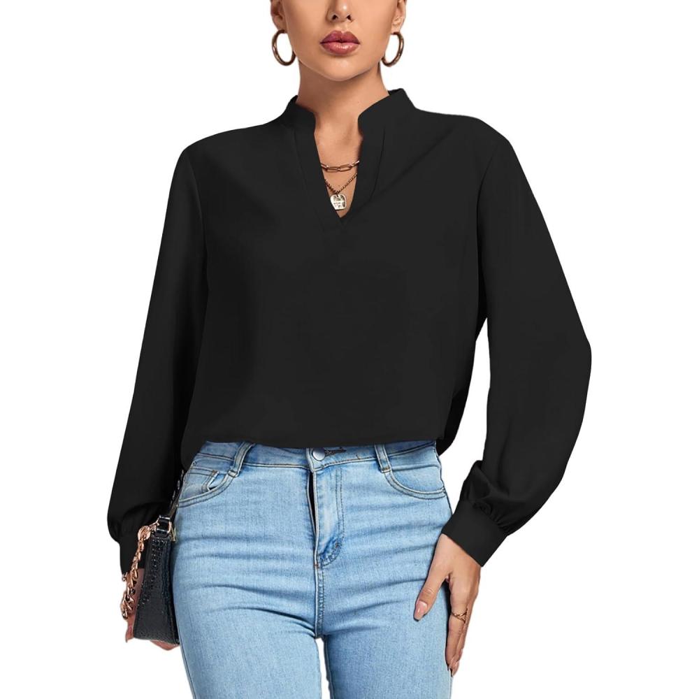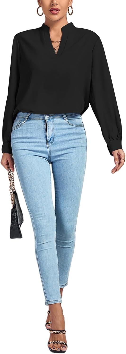 LYANER Women’s V Neck Shirred Long Sleeve Office Elegant Tunic Blouse Top(Black)