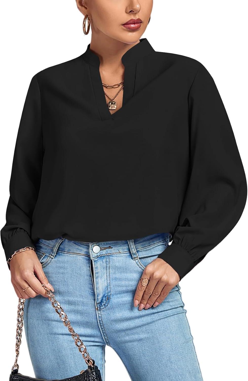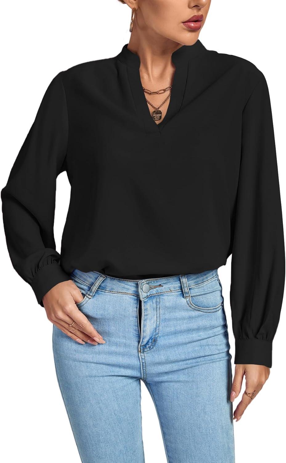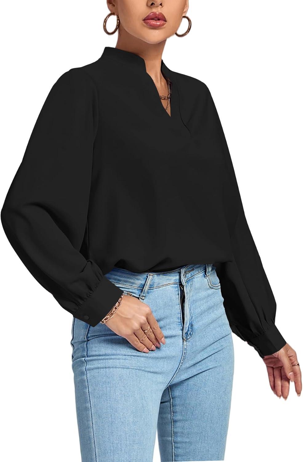 LYANER Women’s V Neck Shirred Long Sleeve Office Elegant Tunic Blouse Top(Black)