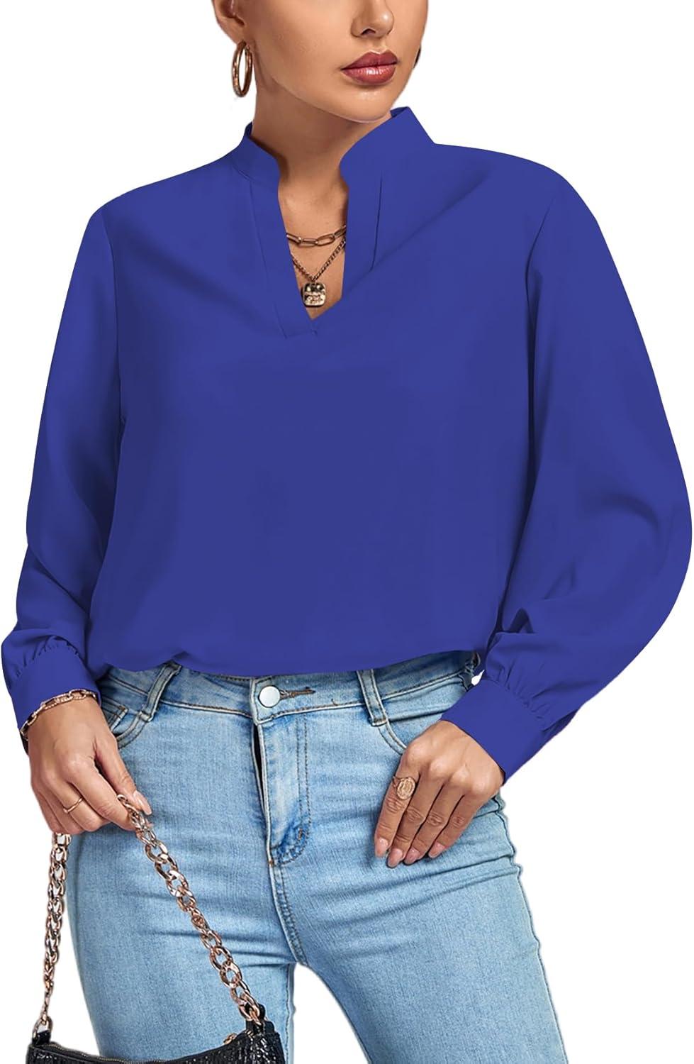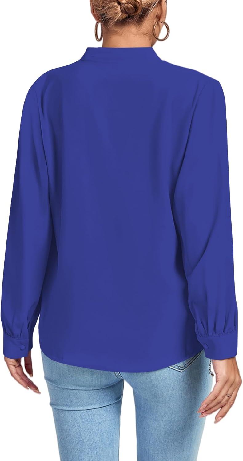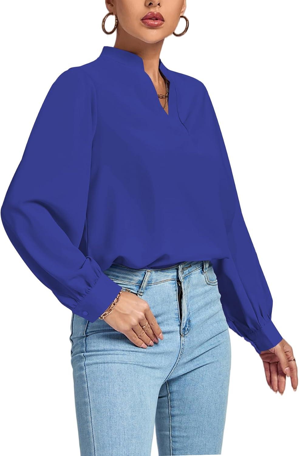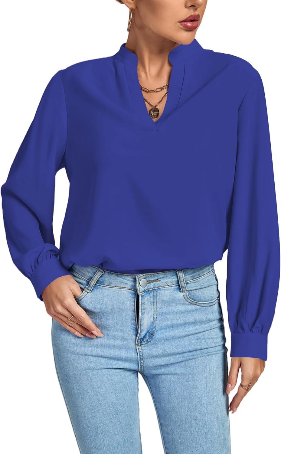 LYANER Women’s V Neck Shirred Long Sleeve Office Elegant Tunic Blouse Top(Royal Blue)